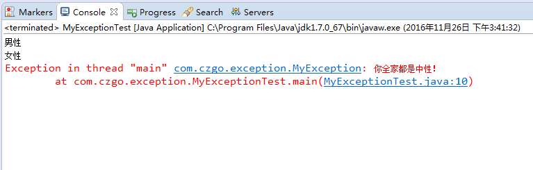 package com.czgo.exception;public class MyExceptionTest {public static void main(String[] args) {String[] sexs = {"男性","女性","中性"};for(int i = 0; i < sexs.length; i++){if("中性".equals(sexs[i])){throw new MyException("你全家都是中性!");}else{System.out.println(sexs[i]);}} }