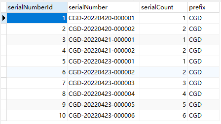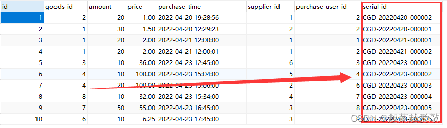 考虑到该字段内容形成,我们可以单独创建一个表purchase_serialnum,专门用来生成和存储固定规则的订单号。(记得写一个测试字段,如下图的第一个内容)