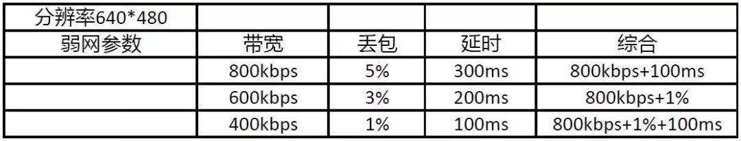 测试常用高清视频分辨率为640*480,一般要求码率为800kbps以上,带宽限制一般设置为三挡,800kbps、600 kbps以及400kbps;丢包会设置5%、3%、1%;延时会设置300ms、200ms、100ms等限制;综合网络情况是将带宽、丢包以及延时进行结合的参数;为了监控用户实际使用的一些情况,也会进行一些4G、3G网络的覆盖;