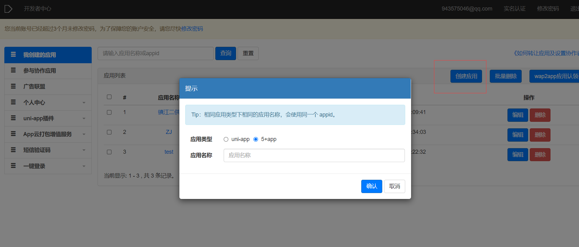 5:登录开发者中心,地址:https://dev.dcloud.net.cn/app/index?type=0
