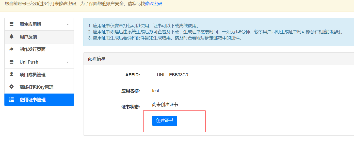 打包页面的证书私钥密码在Dcloud的应用证书管理的证书详情页面的查看证书密码处可以查看,如图所示: