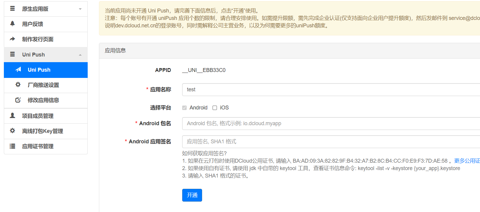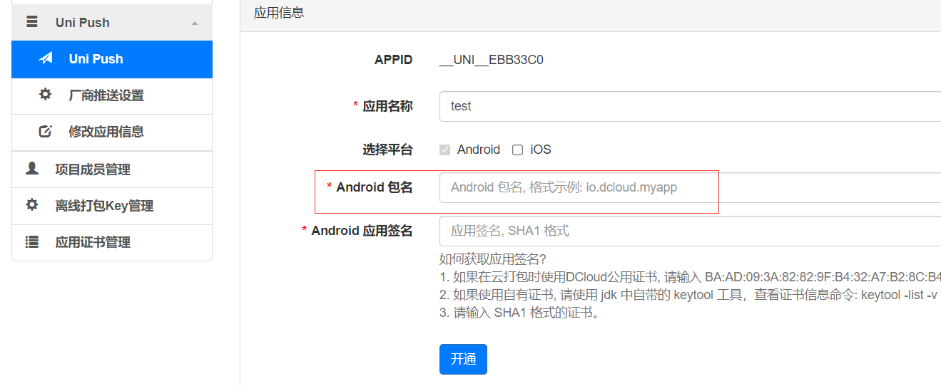 打包页面的Android包名是在Dcloud中开通Uni Push应用时填写的Android签名,如图: