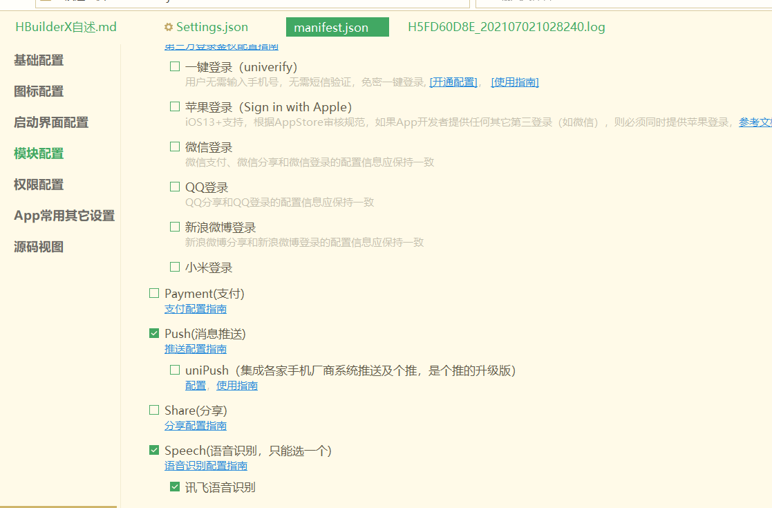 6.3模块配置,如果需要消息推送,Push模块需要勾选,其他模块按照自己的需要勾选,如图所示: