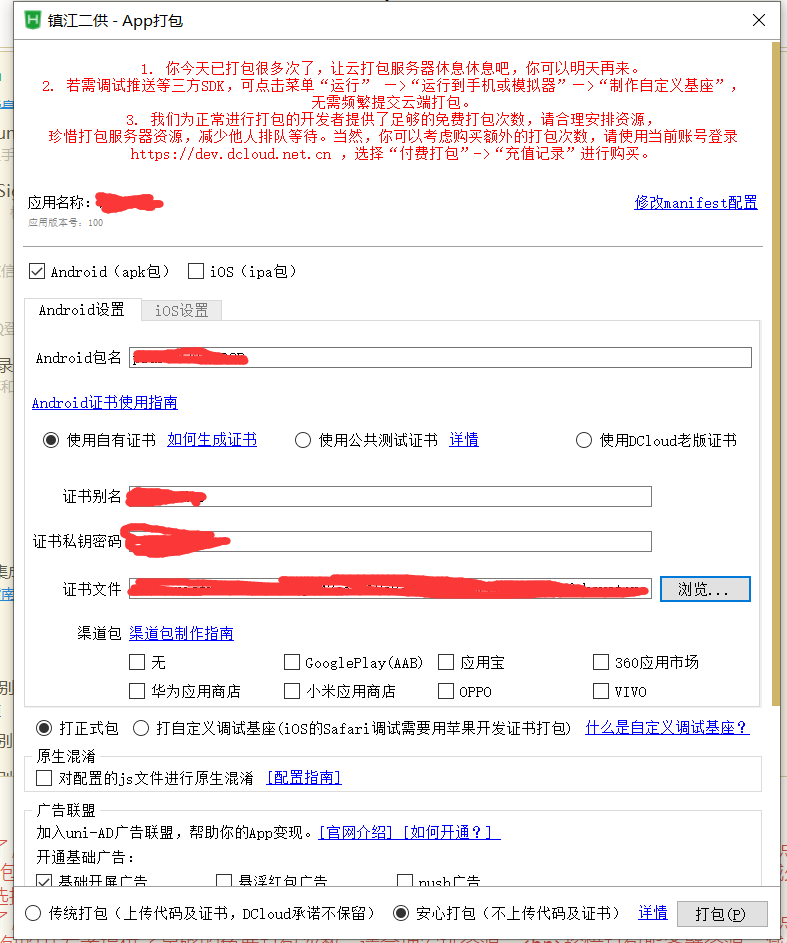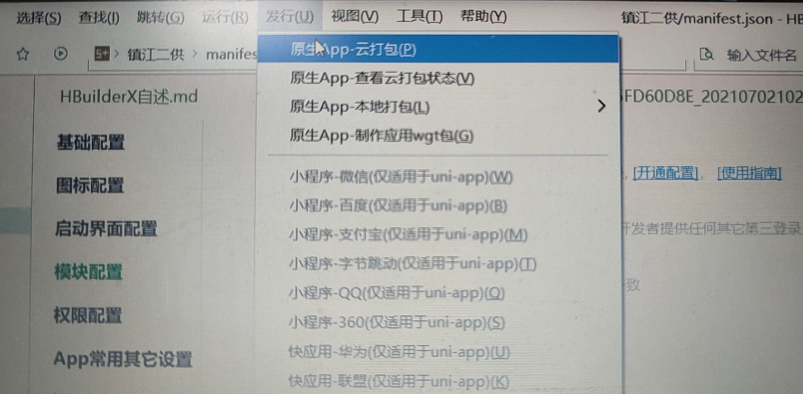 打包过程中可能会出现权限报错、模块报错等,如果不需要的权限直接在权限配置处去掉,不需要的模块直接把勾选去掉,到此大工告成。