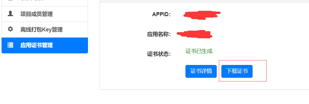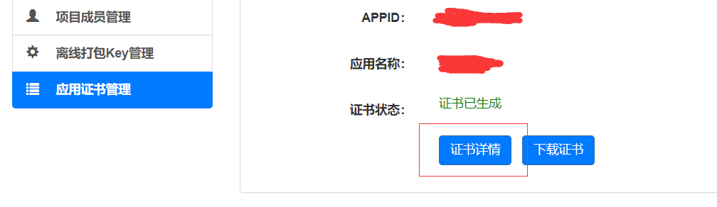 5.2:创建完成后,点击应用名称进入应用内部,点击应用证书管理,然后点击创建证书,如图: