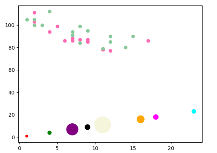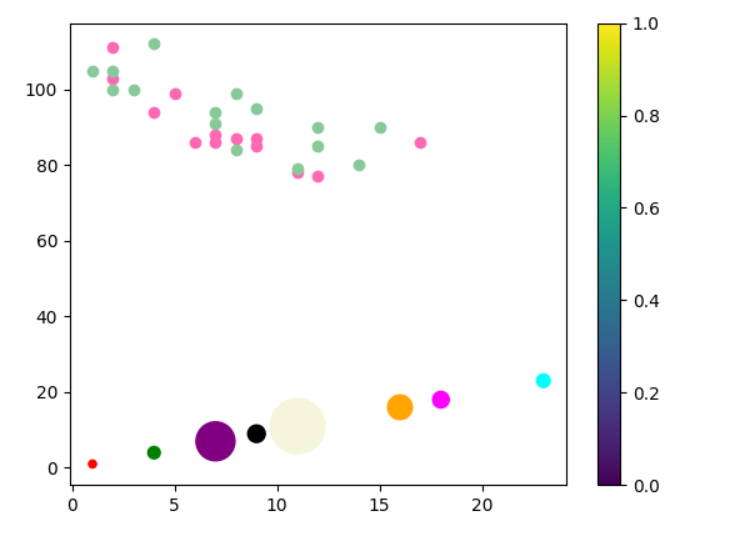 plt.scatter(x, y, c=colors, s=sizes)plt.show()