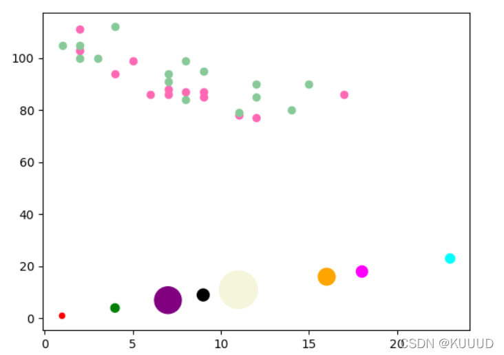 3)plt.scatter() 方法:scatter(x, y, s=None, c=None, marker=None, cmap=None, norm=None, vmin=None, vmax=None, alpha=None, linewidths=None, *, edgecolors=None, plotnonfinite=False, data=None, **kwargs)主要就是x,y为散点所在位置,具体代码如下: