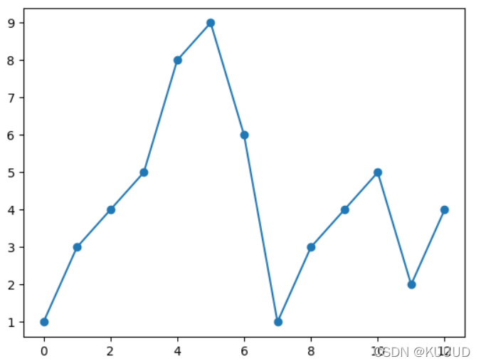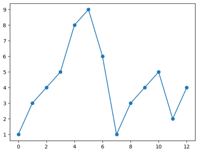 import numpy as npypoints = np.array([1,3,4,5,8,9,6,1,3,4,5,2,4])plt.plot(ypoints, marker = 'o')