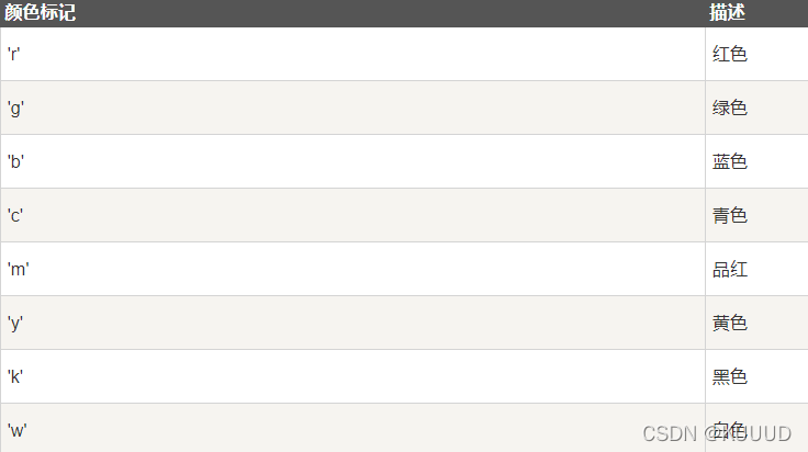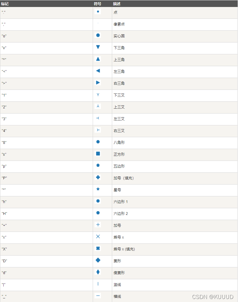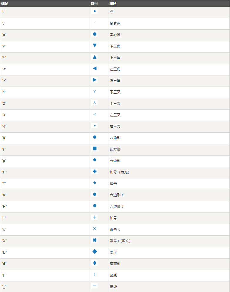 marker,即绘图点的标记可以定义的主要符号如下: