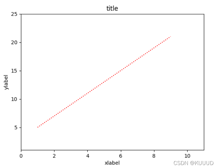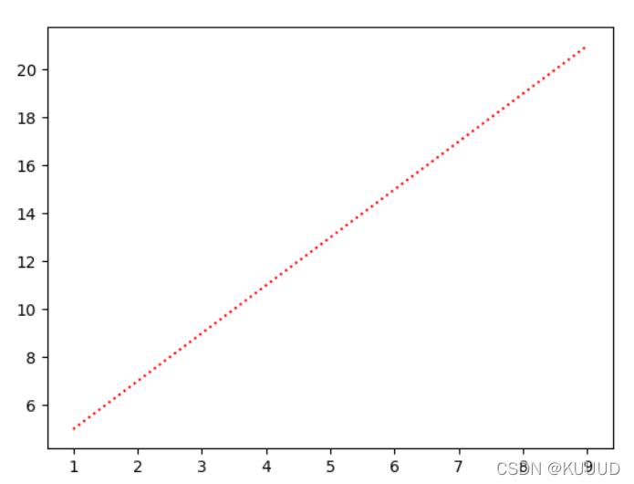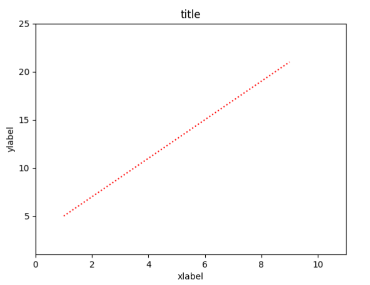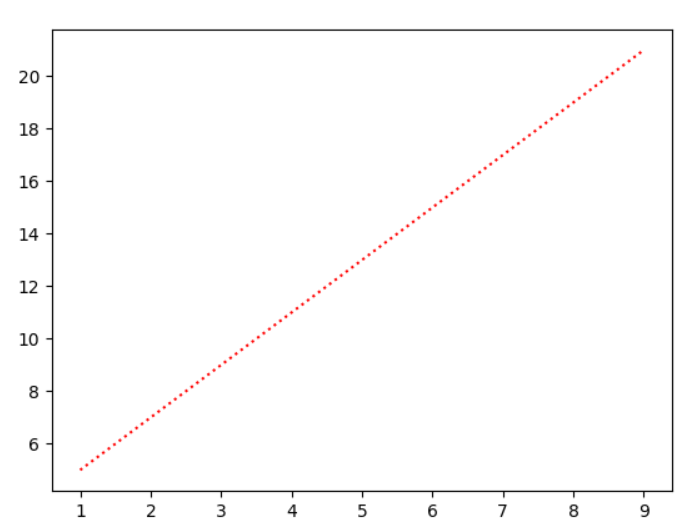y = 2*x + 3plt.plot(x, y, color = 'r', linestyle = 'dotted')#coler 可以简写为 c ,linestyle 可以用简写 lsplt.show()