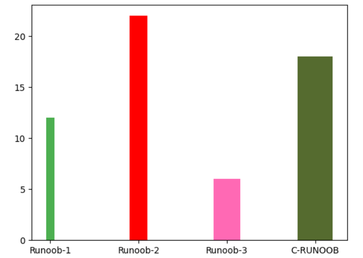 y = np.array([12, 22, 6, 18])plt.bar(x, y, width = [0.1, 0.2, 0.3, 0.4], color = ["#4CAF50","red","hotpink","#556B2F"])