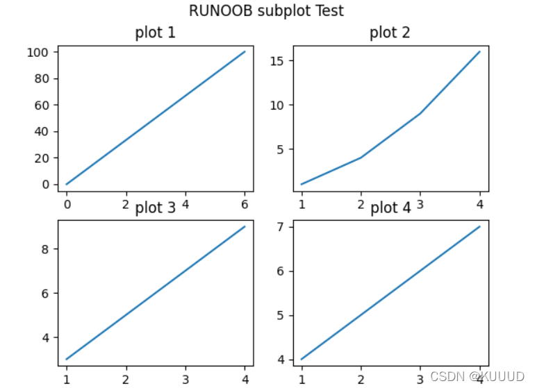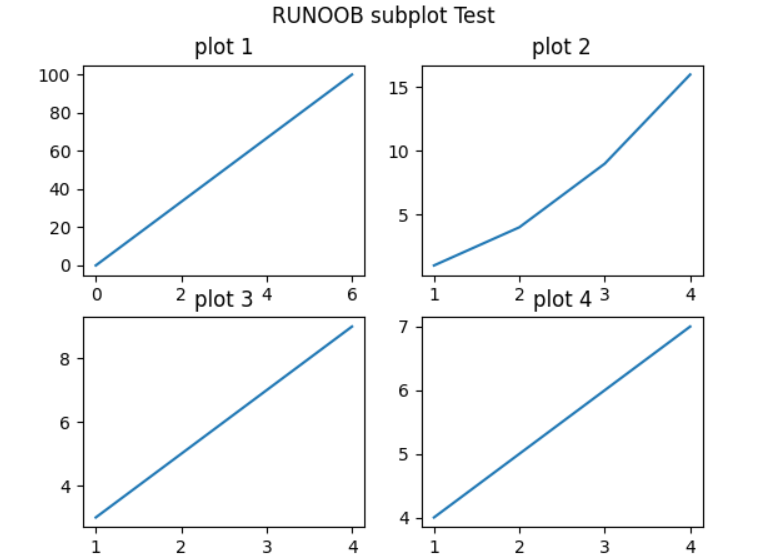 plt.title("plot 4")plt.suptitle("RUNOOB subplot Test")