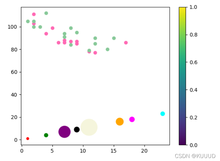 4)plt.colorbar()方法:在旁边显示颜色条,设置颜色条需要使用 cmap 参数,默认值为 'viridis',之后颜色值设置为 0 到 100 的数组,只需添加: