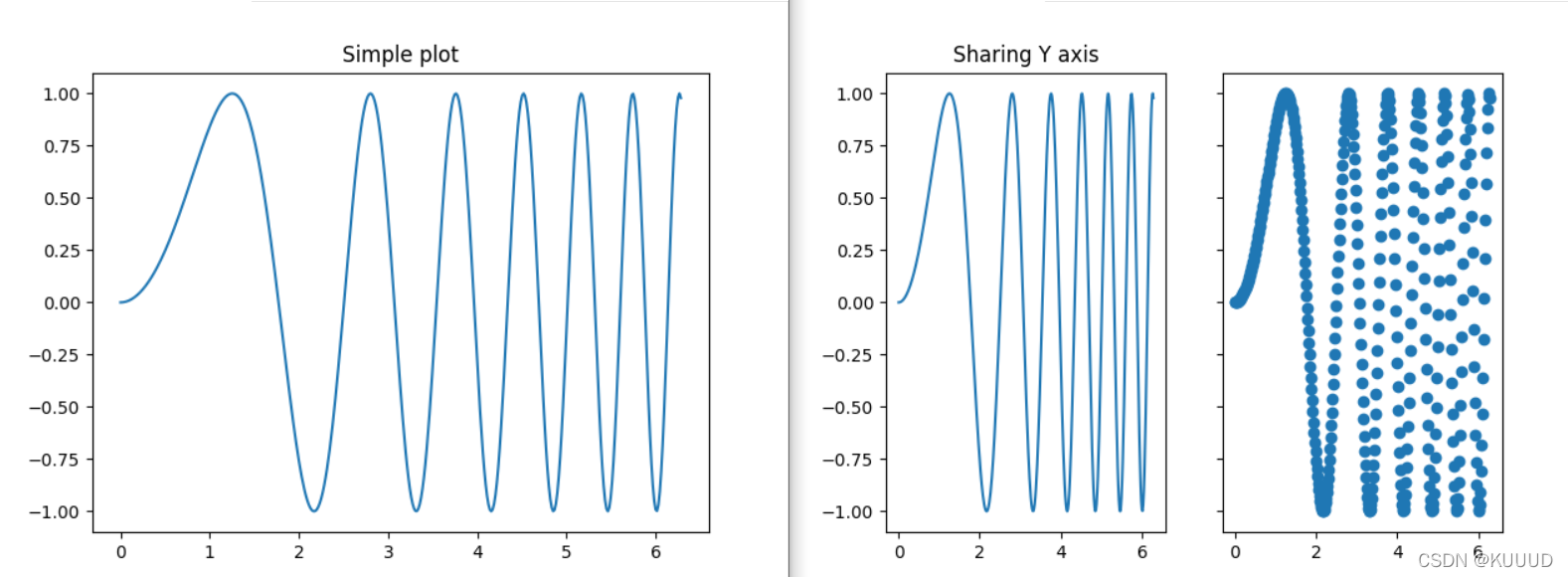 2)plt.subplots()方法:subplots(nrows=1, ncols=1, *, sharex=False, sharey=False, squeeze=True, subplot_kw=None, gridspec_kw=None, **fig_kw)与subplot() 函数相比主要多了共享的概念: