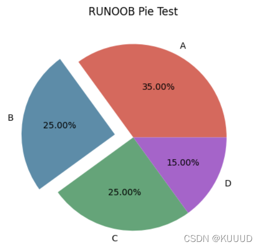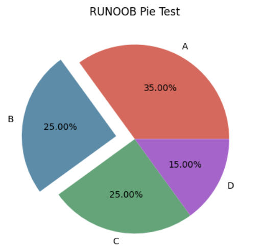 import numpy as npy = np.array([35, 25, 25, 15])plt.pie(y,labels=['A','B','C','D'], # 设置饼图标签colors=["#d5695d", "#5d8ca8", "#65a479", "#a564c9"], # 设置饼图颜色explode=(0, 0.2, 0, 0), # 第二部分突出显示,值越大,距离中心越远autopct='%.2f%%', # 格式化输出百分比)