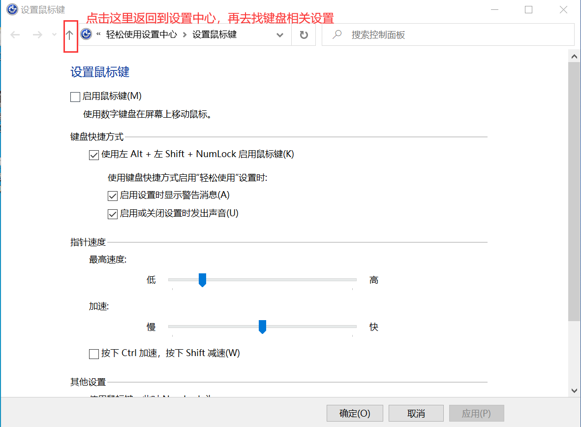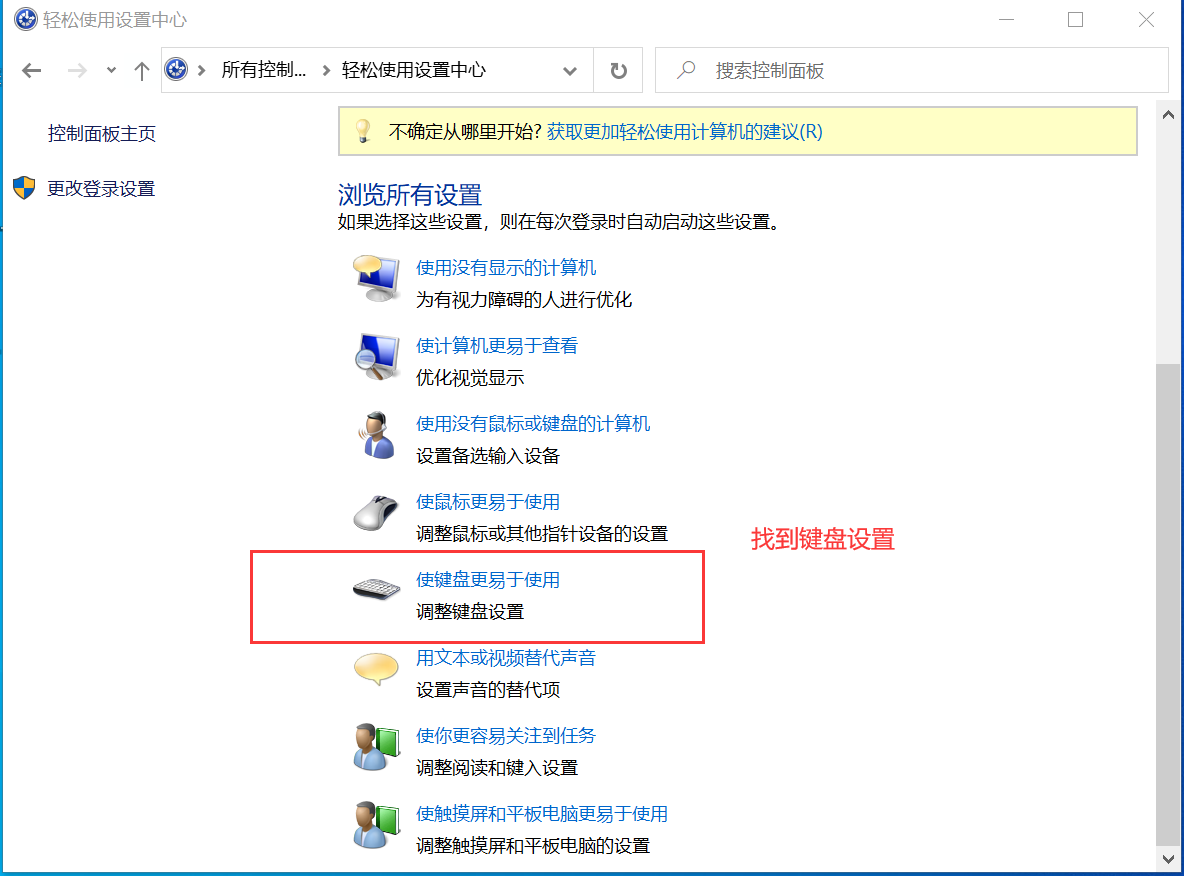 点击在“轻松使用设置中心”控制面板中禁用此键盘快捷方式 然后会进入到下面这个页面