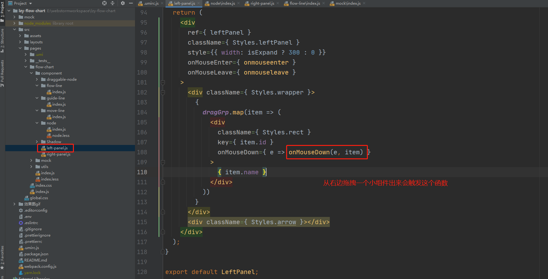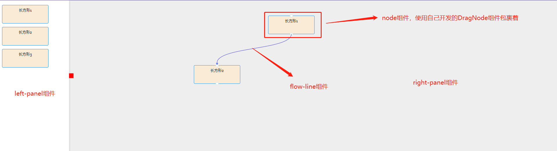 这里讲一下笔者开发的这个流程图demo的架构,一个left-panel组件,它相当于是一个工具栏了,可以通过拖动工具栏的一些流程图小组件到右边的编辑器当中。