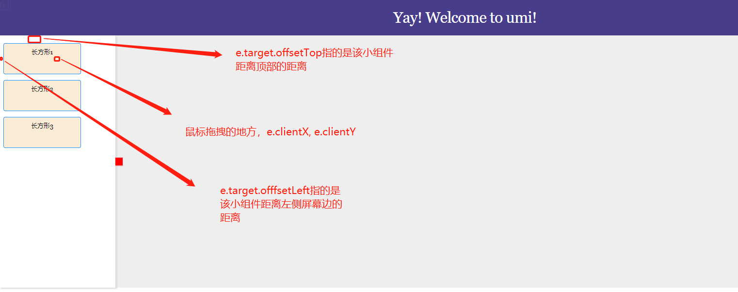 /* 开始拖拽时 */const onMouseDown = (e, node) => {e.preventDefault();/* setIsExpand是拖拽的时候把左边工具栏收起,不是关键代码 */setIsExpand(false);// let flag = false;// createDrag(e);/*获取到左侧栏距离top值,它是相对于父元素的top值(这个值用来判断用户是否拖拽到了编辑器外部去 了) */const leftPanelTop = leftPanel.current.offsetTop;// const leftPanelWidth = leftPanel.current.offsetWidth;/* 获取到鼠标开始点击的时候,小组件的左上角的x,y坐标 *//* 因为用户有可能是拖动小组件的任何一个部位,所以我们要减去它的offsetLeft */const tempX = e.clientX - e.target.offsetLeft;const tempY = e.clientY - e.target.offsetTop;/* 获取拖拽的小组件的宽高,用来计算小组件到时位置的bottom和right值 */const width = e.target.offsetWidth;const height = e.target.offsetHeight;/* 这个函数是用来判断小组件是否拖出了编辑器的边界外的 */function isInRight (e) {const left = e.clientX - tempX;const top = e.clientY - tempY - leftPanelTop;return left > 0 && top > 0;}/* 来到这里就是当组件在拖动过程中触发了 */const move = e => {const curX = e.clientX;const curY = e.clientY;/* 通过减去tempX和tempY得出x,y值 */const x = curX -tempX;const y = curY - tempY;// dragDOM.style.left = `${ x }px`;// dragDOM.style.top = `${ y }px`;// dragDOM.style.borderColor = isInRight(e) ? 'green' : 'red';const _node = { ...node, id: DRAG_DOM_ID, x, y, r: x + width, b: y + height, width, height };/* 总结拖拽出来的_node信息然后扔给父组件进行处理 */props.moveFromLeft(_node);};/* 拖拽完后,释放鼠标触发 */const mouseup = e => {e.preventDefault();document.removeEventListener('mousemove', move);document.removeEventListener('mouseup', mouseup);// if (dragDOM && !flag) {// document.body.removeChild(dragDOM);// dragDOM = null;// }/* 继续判断一下是否拖拽出了编辑器外了 */if (!isInRight(e)) {return false;}/* 计算鼠标释放后,此时小组件在右侧编辑器的top(y),left(x),bottom,right值 */const x = e.clientX - tempX;const y = e.clientY - tempY - leftPanelTop;const r = x + width;const b = y + height;const _node = { ...node, id: getUUID(), x, y, r, b, width, height };/* 总结出释放后小组件的信息(_node),扔给父组件处理 */props.dropNode(_node);};/* 当鼠标点击左侧工具栏的小组件就会从这里开始执行监听 */setTimeout(() => {document.removeEventListener('mousemove', move);document.removeEventListener('mouseup', mouseup);document.addEventListener('mousemove', move);document.addEventListener('mouseup', mouseup);}, 20);};