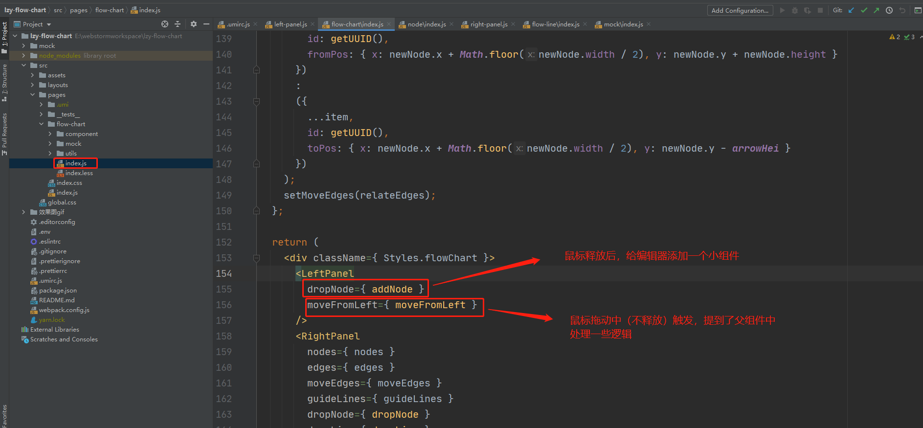 ok,接下来当鼠标拖动完释放后,如果成功,将会把拖动出来的一个节点呈现在右侧编辑器当中,这一部分的逻辑就会交给父组件去处理了(父组件中有个addNode函数是专门处理从左侧拖动节点到右侧编辑器之后的逻辑)