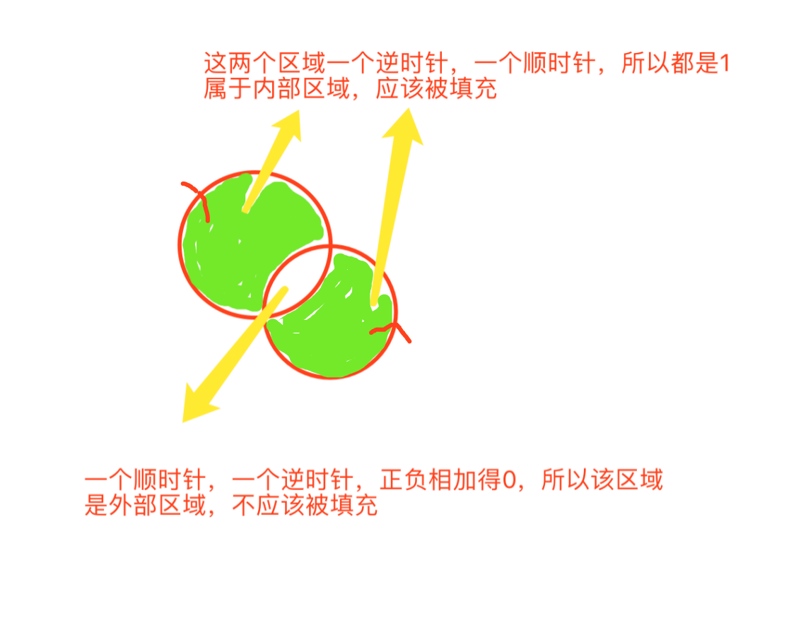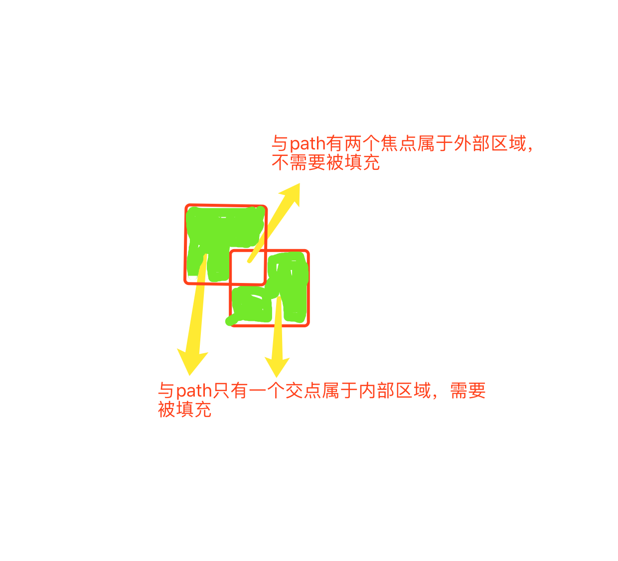 判断 path 区域是否需要被填充的方式:从该区域向外画一条射线,因为 Path 是有方向的(顺时针和逆时针 Path.Direction)。我们假设顺时针为正,逆时针为负,如果最终得到的值的绝对值大于 0 该区域就是内部区域应该被填充,如果==0 该区域为外部区域不可以被填充。所以当与射线相交的边框方向相反(一个顺时针一个逆时针)的时候就是正负得 0,该区域是外部区域不可以被填充