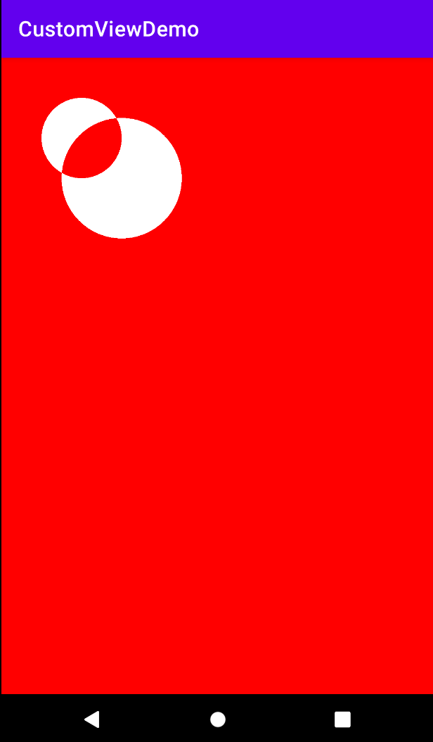 override fun onDraw(canvas: Canvas?) {super.onDraw(canvas)path1.reset()canvas?.apply {path1.addCircle(200f, 200f, 100f, Path.Direction.CW)path1.addCircle(300f, 300f, 150f, Path.Direction.CCW)path1.fillType = Path.FillType.INVERSE_WINDINGdrawPath(path1, paint)}}