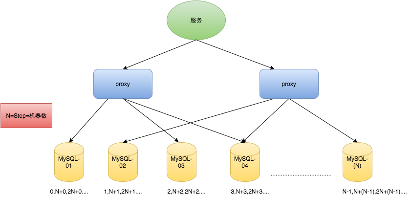 - 假设我们要部署N台机器,步长需设置为N,每台的初始值依次为0,1,2…N-1那么整个架构就变成了如下图所示: