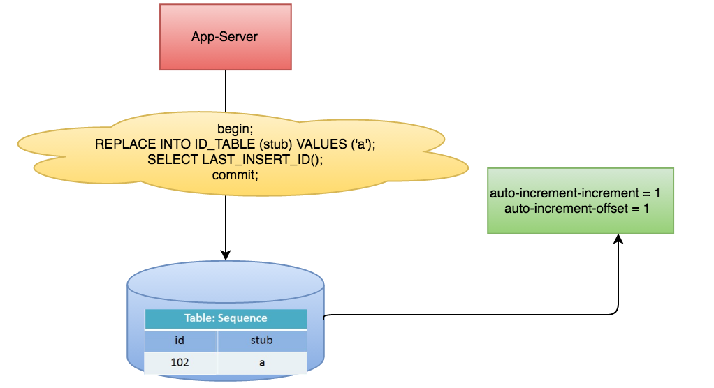 auto_increment_increment和auto_increment_offset来保证ID自增,每次业务使用下列SQL读写MySQL得到ID号。