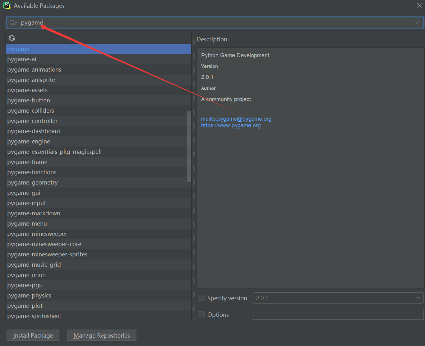 在这里输入你所需要的包之后点击install Package之后就把包安装到了你这个python的项目中,非常方便(注意:电脑挂着VPN会导致install失败)。但是有一个缺点就是无法指定扩展包的版本,所以只能初学的时候使用。那么如何更加方便的调用python扩展包呢,这里我们就可以使用anaconda来管理我们的包。