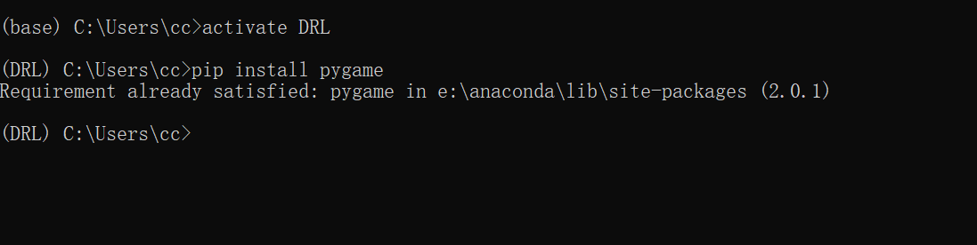 这里我就可以用DRL的环境去跑深度强化学习代码,test的环境去跑python练习题目代码,而我现在比如我需要在DRL的环境中添加pygame扩展包,我只需要先进入到DRL环境中,然后直接pip install pygame 就可以