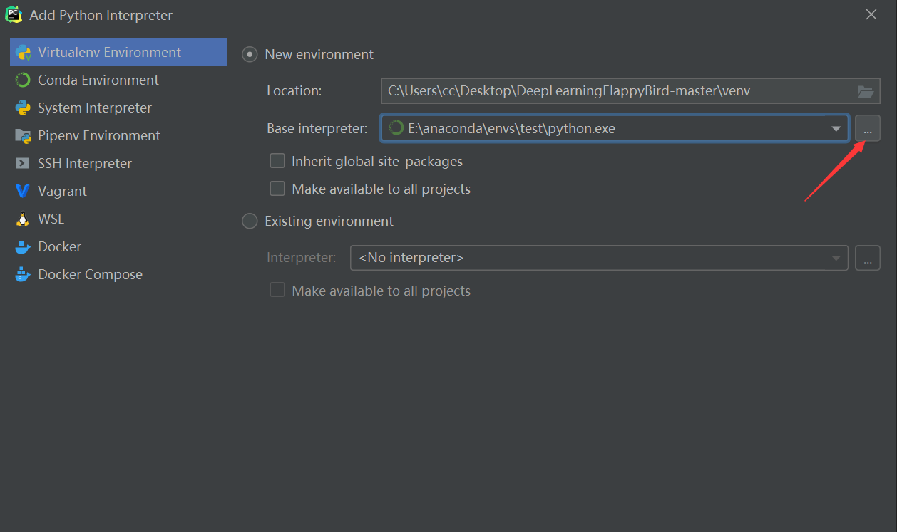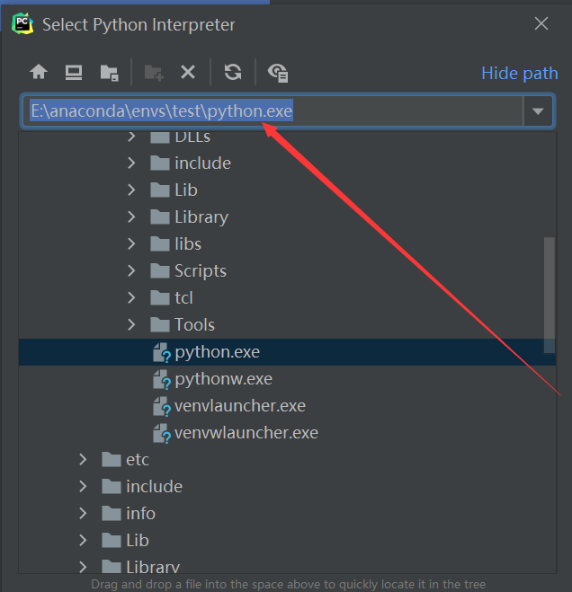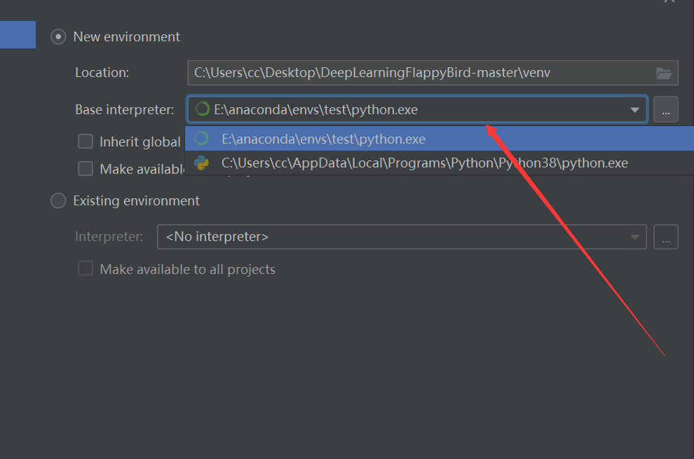 像这样把环境中的python.exe文件导入即可,这里我导入的是test环境,如果需要导入DRL环境就把路径中的test换成DRL即可。