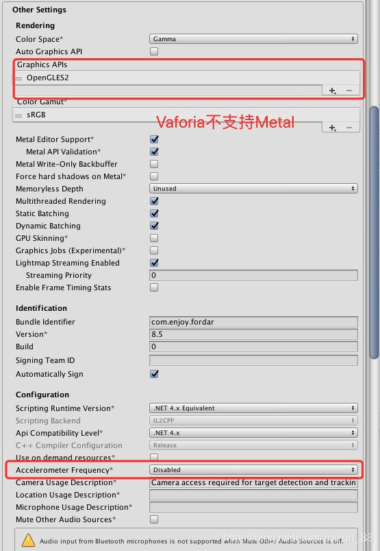 去掉Graphics APIs中的Metal(因为Vuforia不支持Metal,此项仅针对Vuforia)