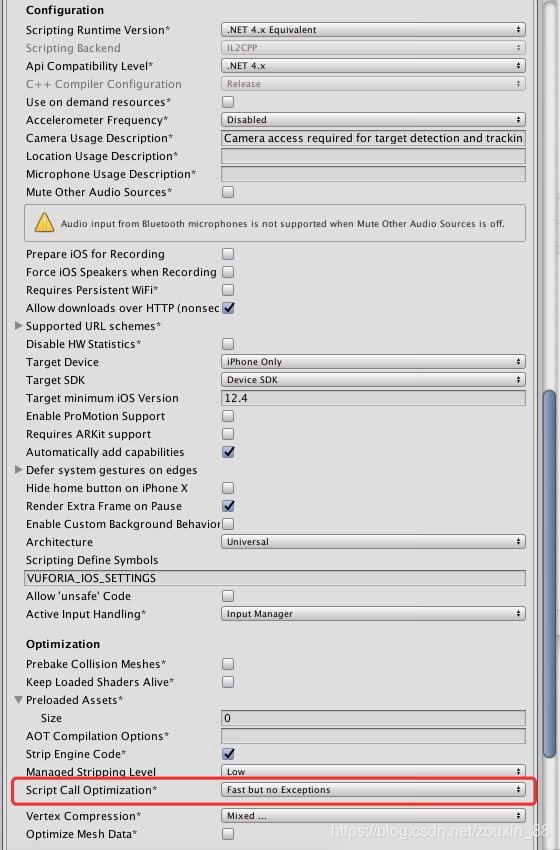 最近使用Unity3d2018.4.13+Vuforia开发了一个AR项目,发布到iOS平台,一开始运行卡顿,频烦闪退。后面查阅官方文档,在【Player Setting...】【OtherSetting】中修改了三项。