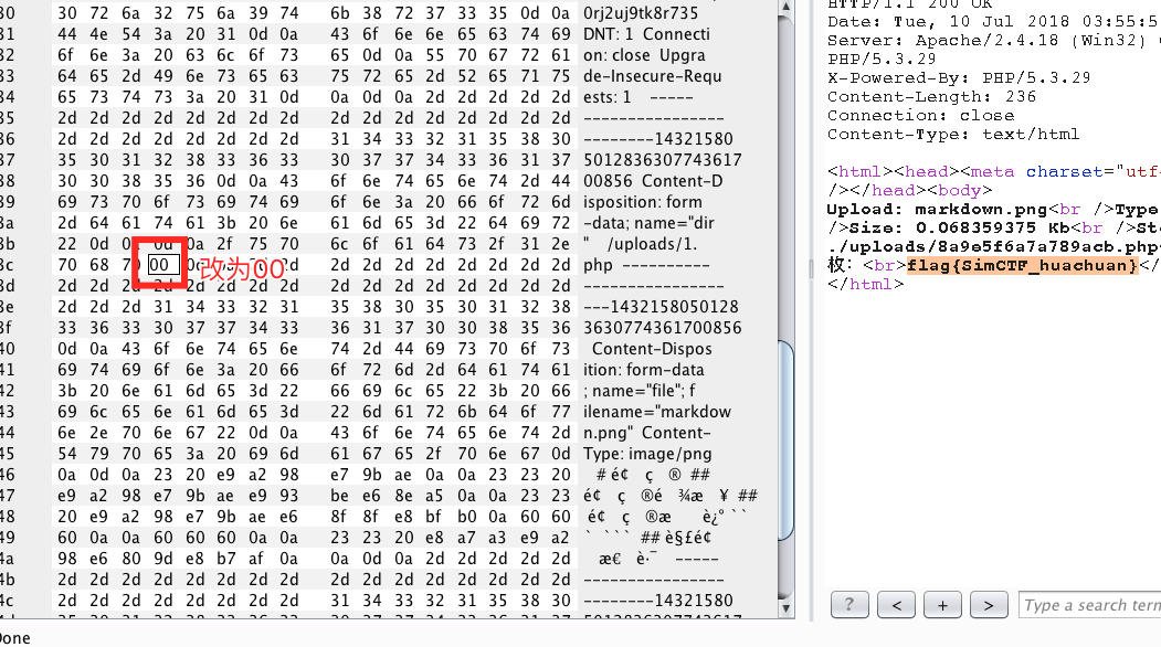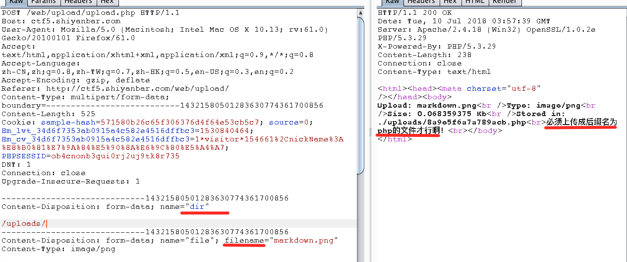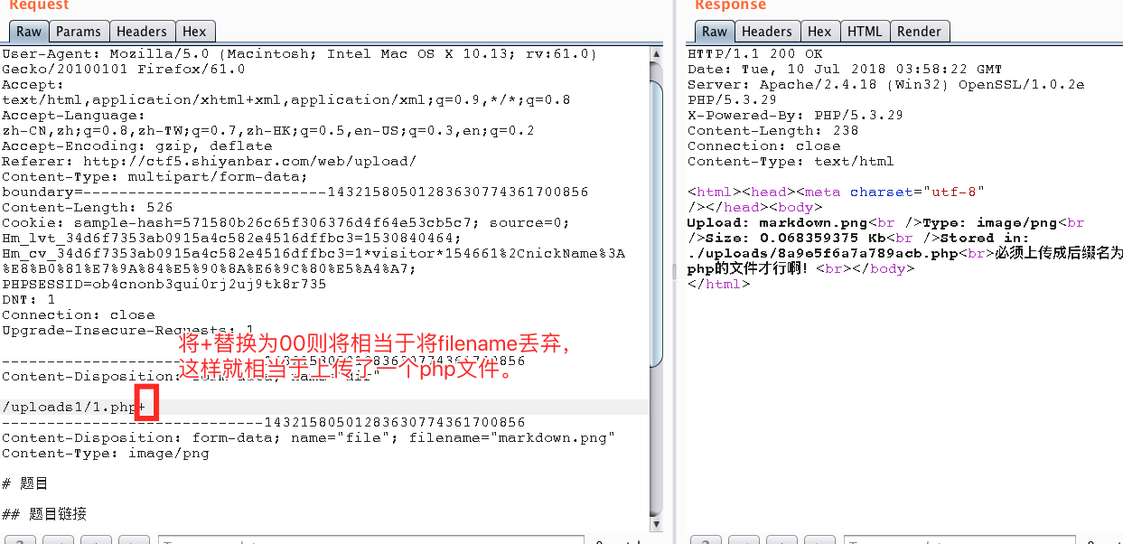 推测最后保存文件的名称为dir + filename,所以使用00截断来构造绕过php不能上传的问题。