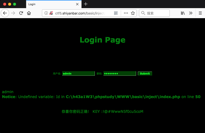 使用各种万能注入不能登录,测试payloadhttp://ctf5.shiyanbar.com/basic/inject/index.php?admin=admin' and sleep(10) and ''='&pass=&action=login,发现响应时间很长,确认该题目为sleep盲注。