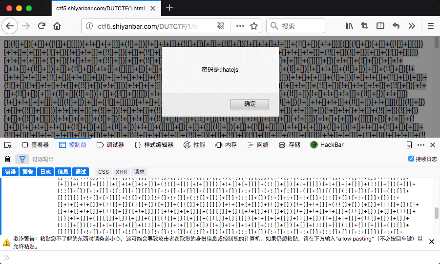 打开题目,就可以看到是jsfuck编码,直接在浏览器console控制台执行这段代码就可以了。