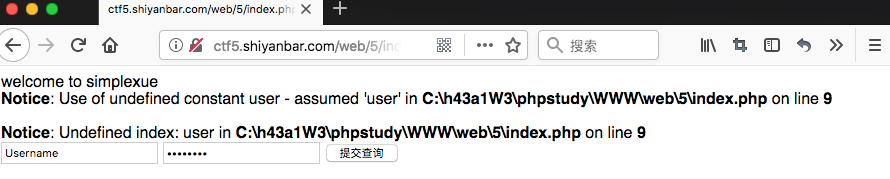 直接给出payloaduser=' union select md5(1)# and &pass=1,这条语句拼出的sql语句为select pw from php where user='' union select md5(1)#‘。这样查询出的pw值就是用户输入的md5(1),当pass参数也输入1时,就绕过了条件了,得到flag :SimCTF{youhaocongming}。