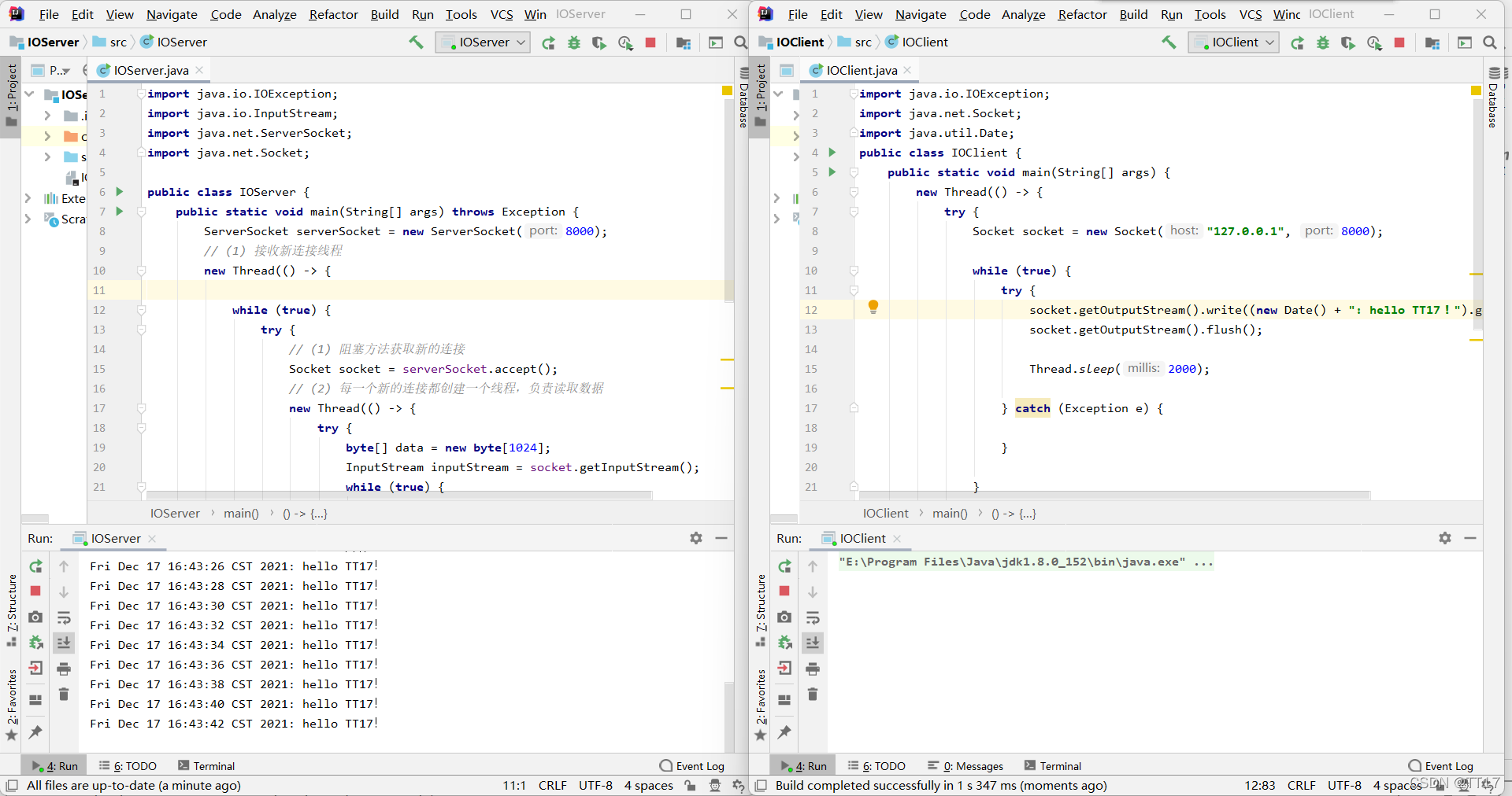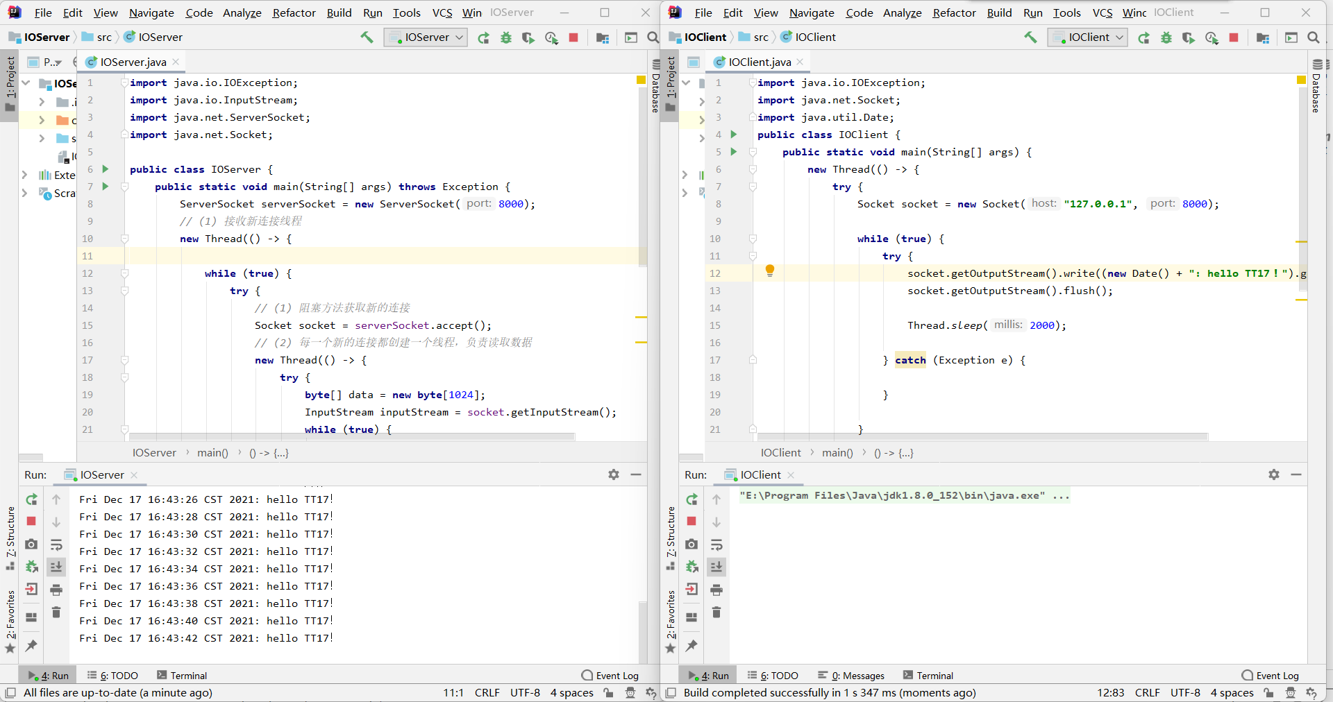 public class IOClient {public static void main(String[] args) {new Thread(() -> {try {Socket socket = new Socket("127.0.0.1", 8000);while (true) {try {socket.getOutputStream().write((new Date() + ": hello 死妖阿!").getBytes());socket.getOutputStream().flush();Thread.sleep(2000);} catch (Exception e) {}}} catch (IOException e) {}}).start();}}
