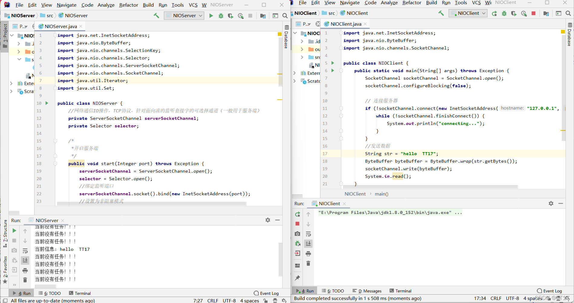 import java.util.Set;public class NIOServer {//网络通信IO操作,TCP协议,针对面向流的监听套接字的可选择通道(一般用于服务端)private ServerSocketChannel serverSocketChannel;private Selector selector;/**开启服务端*/public void start(Integer port) throws Exception {serverSocketChannel = ServerSocketChannel.open();selector = Selector.open();//绑定监听端口serverSocketChannel.socket().bind(new InetSocketAddress(port));//设置为非阻塞模式serverSocketChannel.configureBlocking(false);//注册到Selector上serverSocketChannel.register(selector, SelectionKey.OP_ACCEPT);startListener();}private void startListener() throws Exception {while (true) {// 如果客户端有请求select的方法返回值将不为零if (selector.select(1000) == 0) {System.out.println("当前没有任务!!!");continue;}// 如果有事件集合中就存在对应通道的keySet selectionKeys = selector.selectedKeys();Iterator iterator = selectionKeys.iterator();// 遍历所有的key找到其中事件类型为Accept的keywhile (iterator.hasNext()) {SelectionKey key = iterator.next();if (key.isAcceptable())handleConnection();if (key.isReadable())handleMsg(key);iterator.remove();}}}/*** 处理建立连接*/private void handleConnection() throws Exception {SocketChannel socketChannel = serverSocketChannel.accept();socketChannel.configureBlocking(false);socketChannel.register(selector, SelectionKey.OP_READ, ByteBuffer.allocate(1024));}/** 接收信息*/private void handleMsg(SelectionKey key) throws Exception {SocketChannel channel = (SocketChannel) key.channel();ByteBuffer attachment = (ByteBuffer) key.attachment();channel.read(attachment);System.out.println("当前信息: " + new String(attachment.array()));}public static void main(String[] args) throws Exception {NIOServer myServer = new NIOServer();myServer.start(8887);}