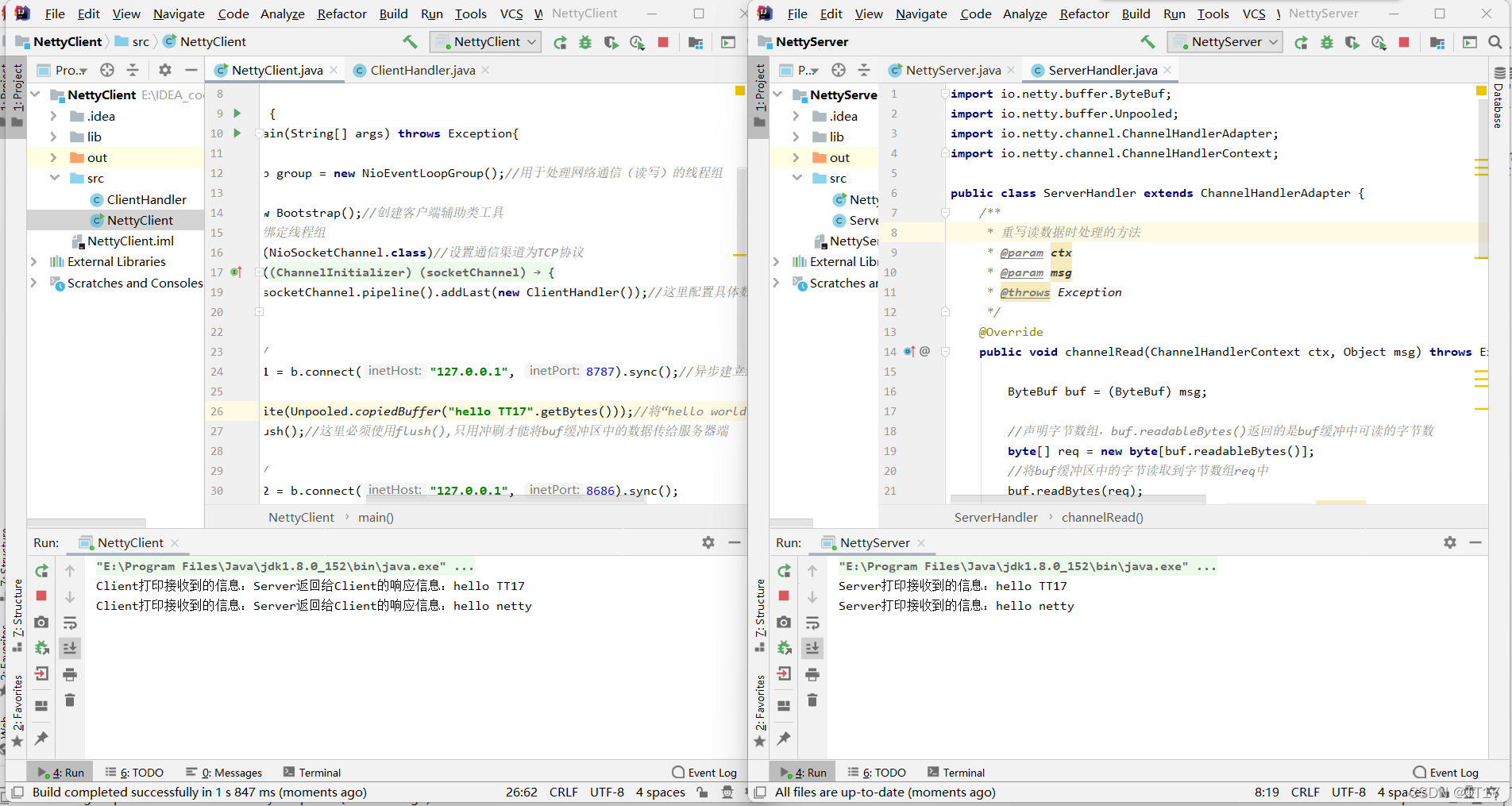 import io.netty.channel.socket.nio.NioSocketChannel;public class NettyClient {public static void main(String[] args) throws Exception{NioEventLoopGroup group = new NioEventLoopGroup();//用于处理网络通信(读写)的线程组Bootstrap b = new Bootstrap();//创建客户端辅助类工具b.group(group)//绑定线程组.channel(NioSocketChannel.class)//设置通信渠道为TCP协议.handler(new ChannelInitializer() {protected void initChannel(SocketChannel socketChannel) throws Exception {socketChannel.pipeline().addLast(new ClientHandler());//这里配置具体数据接收方法的处理}});/*与8787端口通讯*/ChannelFuture cf1 = b.connect("127.0.0.1", 8787).sync();//异步建立连接cf1.channel().write(Unpooled.copiedBuffer("hello 死妖阿".getBytes()));//将“hello world”写到buf缓冲区cf1.channel().flush();//这里必须使用flush(),只用冲刷才能将buf缓冲区中的数据传给服务器端/*与8686端口通讯*/ChannelFuture cf2 = b.connect("127.0.0.1", 8686).sync();cf2.channel().writeAndFlush(Unpooled.copiedBuffer("hello netty".getBytes()));cf1.channel().closeFuture().sync();//等待关闭,相当于Thread.sleep(Integer.MAX_VALUE)cf2.channel().closeFuture().sync();group.shutdownGracefully();//关闭线程组}