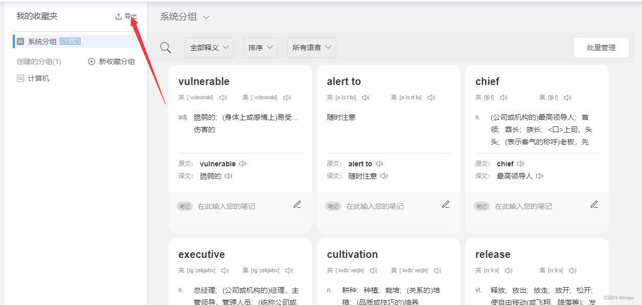 百度翻译把默认的收藏夹取名为生词本,然后里面有一个卡片模式,就是我上面说的需求。生词本甚至可以打印,批量导入,导入的方式可以是输入、甚至是拍照识别!生词本也有隐藏释义的功能。然后卡片模式里,可以自动翻页、朗读,可以设置展示单词、释义,可以显示一个,也可以都不显示。比如都不显示,就可以模拟现实生活中的听写。