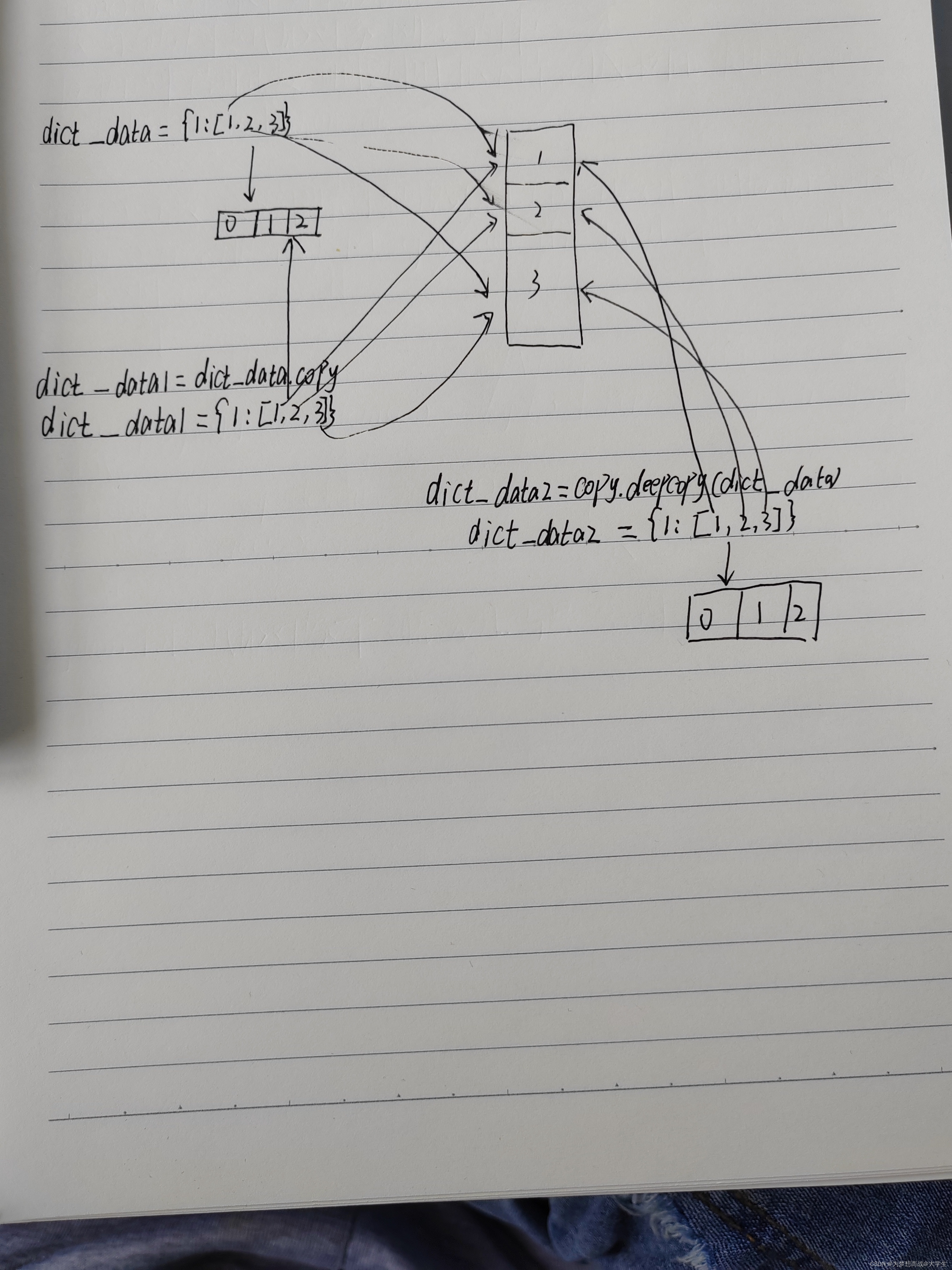 import copydict_data = {1: [1, 2, 3]} dict_data1 = dict_data.copy() dict_data2 = copy.deepcopy(dict_data) print(dict_data1) print(dict_data2) print(id(dict_data), id(dict_data1), id(dict_data2)) print(id(dict_data[1]), id(dict_data1[1]), id(dict_data2[1])) print(id(dict_data[1][0]), id(dict_data1[1][0]), id(dict_data2[1][0])) print(id(dict_data[1][1]), id(dict_data1[1][1]), id(dict_data2[1][1])) print(id(dict_data[1][2]), id(dict_data1[1][2]), id(dict_data2[1][2]))显示: