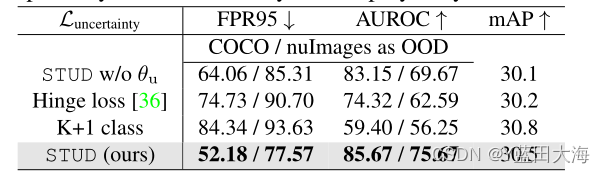 对不确定性正则化权重β的消融。表4报告了当我们改变L不确定性的权重β时的OOD检测结果。该模型在COCO和nuImages数据集上都被评估为OOD。结果表明,一个温和的权重是可取的。在大多数情况下。STUD在AUROC方面优于表1中的基线OOD检测方法。
