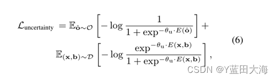不确定性正则化。我们采用了一个损失函数,对比塑造了不确定性表面,放大了已知ID对象和未知OOD对象之间的可分性。为了测量不确定性,我们使用等式(4)中的能量分数,该分数来自分类分支的输出。在这里,我们计算ID对象和提取的未知对象特征E(ô)的能量分数E(x,b)。然后将不确定性分数传递到具有权重系数θu的logistic回归分类器,该分类器预测ID对象(x,b)的高概率和未知对象的低概率。正则化损失计算如下: