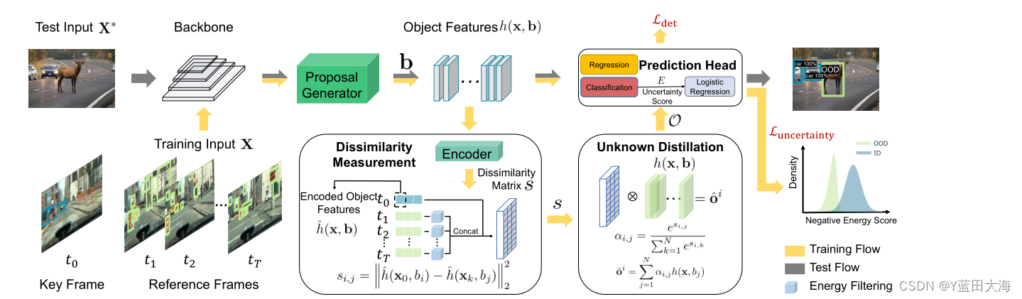 图2. 拟议的未知物体检测框架STUD概述。对于一个来自关键帧的ID对象编码为 ˆ h(x 0 ,b i ),我们进行能量过滤,以识别参考帧中的未知对象候选者。然后,我们通过线性组合特征空间中的未知对象来提炼出未知对象ô i,并以异同得分s i,j加权。蒸馏出来的未知物体和ID物体一起被用来训练不确定性正则化分支(L uncertainty )。L不确定性对比性地塑造了不确定性表面,对ID对象产生较大的分数,反之亦然。在测试过程中,我们使用逻辑回归的输出进行OOD检测。⊗表示方程(3)中的运算,1≤k≤T是参考框架的索引。
