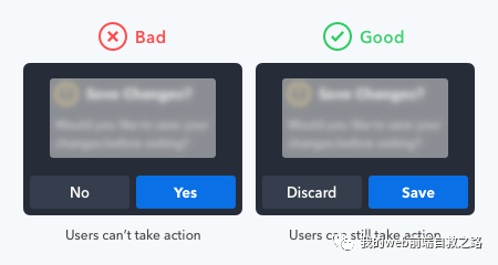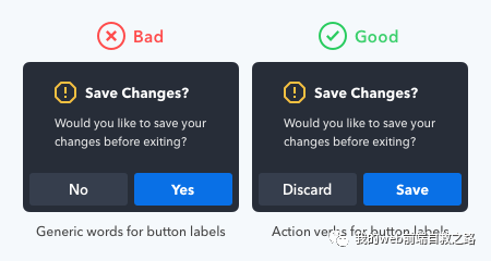 可以与对话框中通用的“是/否”按钮文本做一下对比。对于后者,用户需要读完对话框文本才能采取操作。如果他们跳过或者是曲解了文本的意思,那么他们很容易会按错按钮。这样的设计不仅增加了误操作的风险,而且迫使用户不得不花费时间去阅读文本。