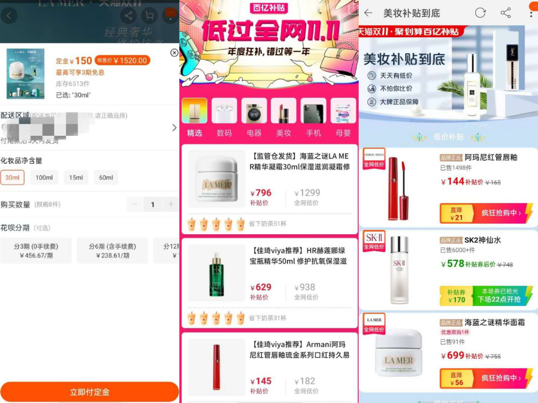 有消费者对各家平台的补贴力度进行了比对,海蓝之谜精华面霜(30ml)在官方旗舰店预售价1520元(有赠品),在聚划算百亿补贴下699元,拼多多百亿补贴下796元。