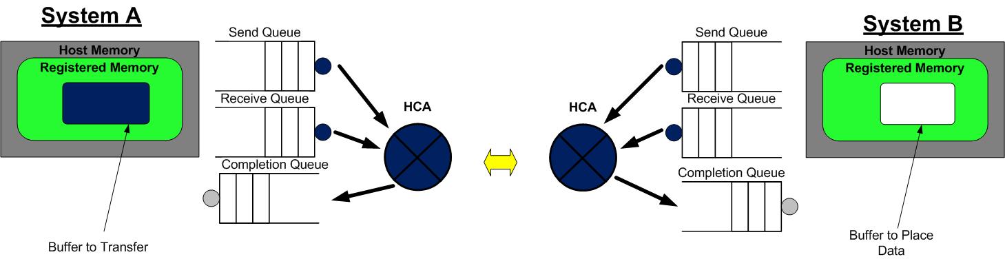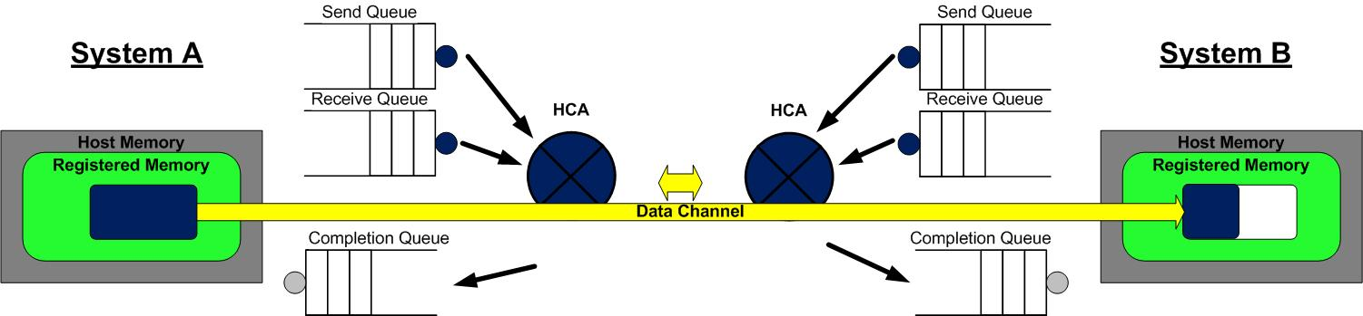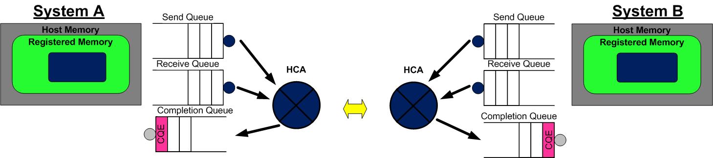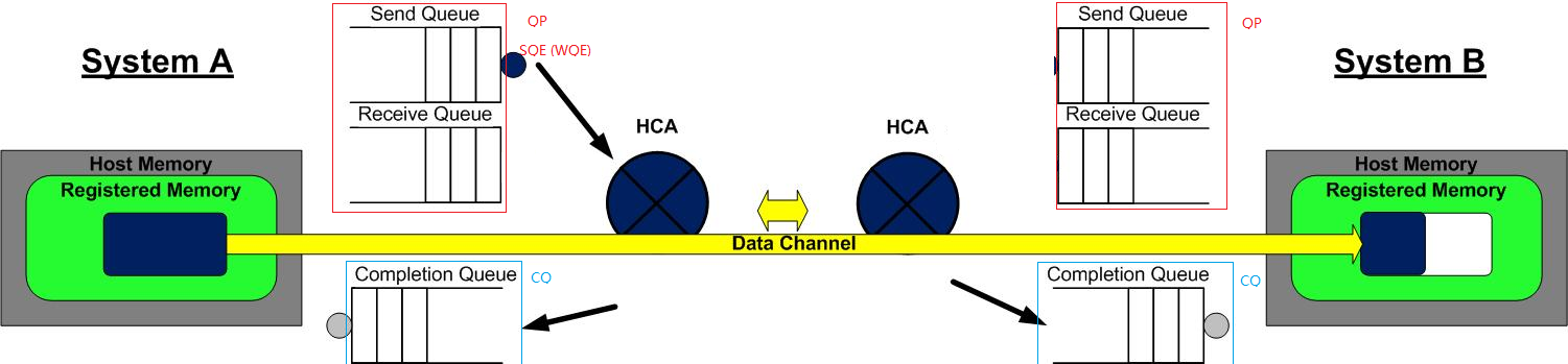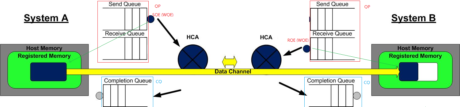 A和B分别向自己的WQ中注册WQE,对于A,WQ=SQ,WQE描述指向一个等到被发送的数据;对于B,WQ=RQ,WQE描述指向一块用于存储数据的buffer。