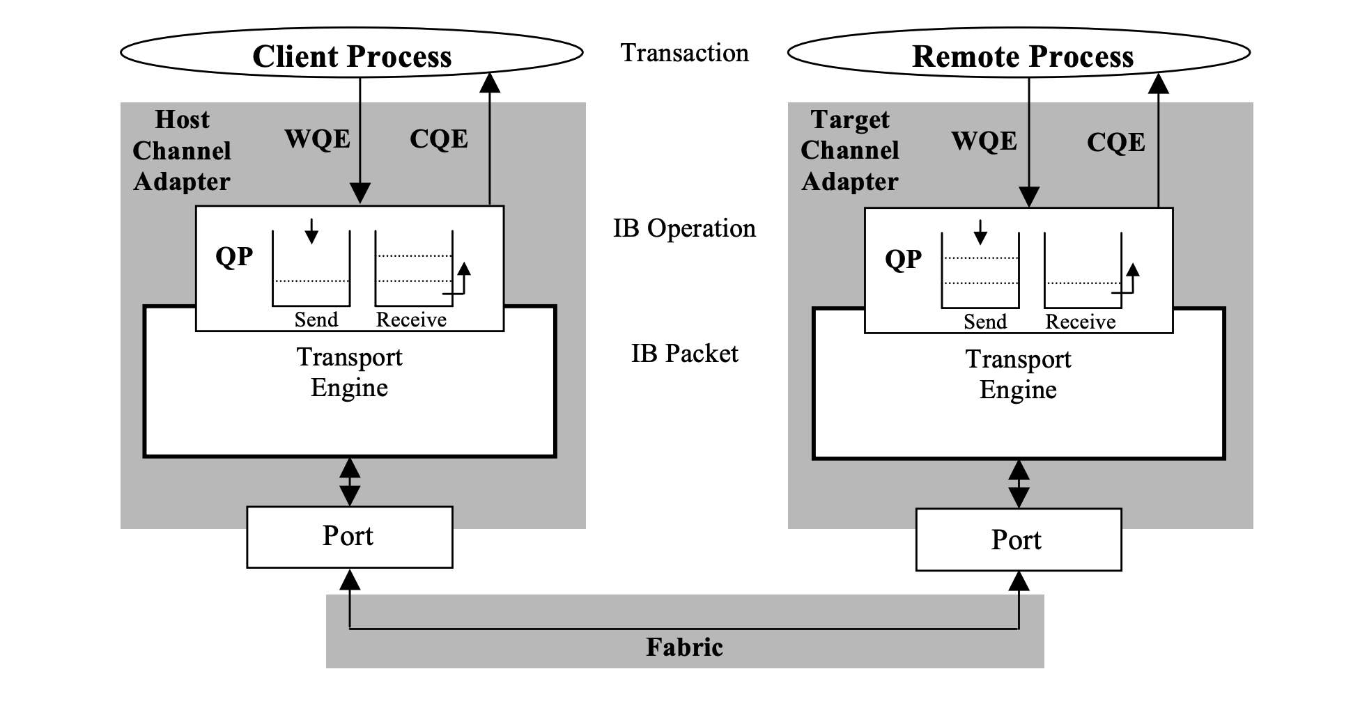 RDMA提供了基于消息队列的点对点通信,当应用需要通信时,就会创建一条Channel连接,每条Channel的两端各有一对队列(Send Queue(SQ)和Receive Queue(RQ)),合称Queue Pairs(QP),除此之外,两端还需要一个 完成队列-Complete Queue(CQ),CQ用来存放 发送和接收请求处理完成的通知。