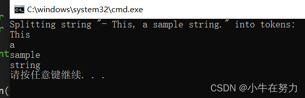 {char str[] = "- This, a sample string.";char * pch;printf("Splitting string \"%s\" i nto tokens:\n", str);pch = my_strtok(str, " ,.-");while (pch != NULL){printf("%s\n", pch);pch = my_strtok(NULL, " ,.-");}return 0;