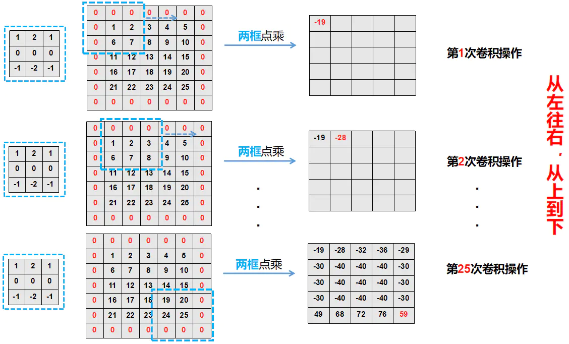 滑动卷积计算,其实就是对应的"两个小矩阵"的"点乘并求和"。"滑动"是指:卷积核沿着"扩边后的原始数据"从左到右,从上到下进行。如图2所示: